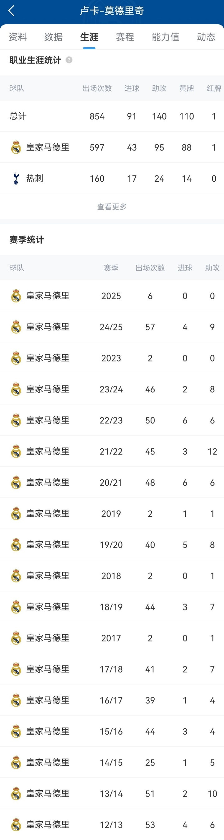 莫德里奇于2012年加盟皇马,效力13年共出战597场,打进43球助攻95次,帮助球队夺得28座冠军奖杯:6次欧冠、6次世俱杯、5次欧洲超级杯、4次西甲联赛、2次国王杯和5次西班牙超级杯,并与今夏世俱杯后自由身离队。