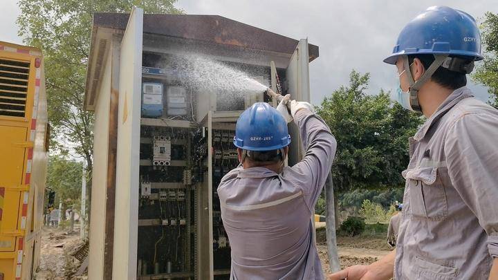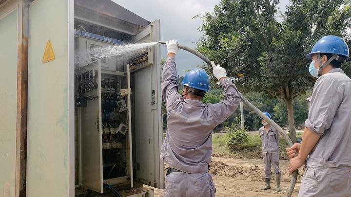 南方电网兴义供电局支援队以“三洗一吹一实验”的方式清洗修复被洪水浸泡过的配电设备八戒策略八戒策略。卢关文摄